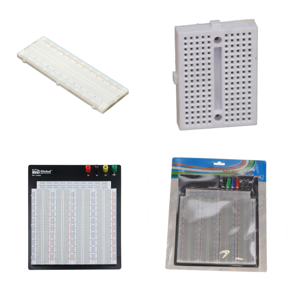 <h1> Solderless Breadboards </h1> <p> Solderless breadboard products provide a convenient means of interconnecting electronic components in hobby, educational, or development contexts, without the need for soldering or similar fixation processes. Composed of U-shaped metallic contacts positioned beneath a grid of holes in an electrically insulating housing, component leads, and wire segments inserted through the holes in the insulator are electrically connected and retained under spring tension by the contacts beneath. Though easily reconfigurable and thus ideal for experimentation, they do not provide mechanically robust interconnections, and introduce significant parasitic circuit elements which make them ill-suited for high-speed circuits. </p>